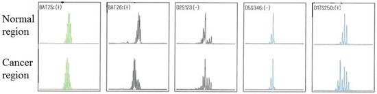- Boland, C.R.; Thibodeau, S.N.; Hamilton, S.R.; Sidransky, D.; Eshleman, J.R.; Burt, R.W.; Meltzer, S.J.; Rodriguez-Bigas, M.A.; Fodde, R.; Ranzani, G.N.; et al. A National Cancer Institute Workshop on Microsatellite Instability for cancer detection and familial predisposition: Development of international criteria for the determination of microsatellite instability in colorectal cancer. Cancer Res. 1998, 58, 5248–5257. [Google Scholar] [PubMed]