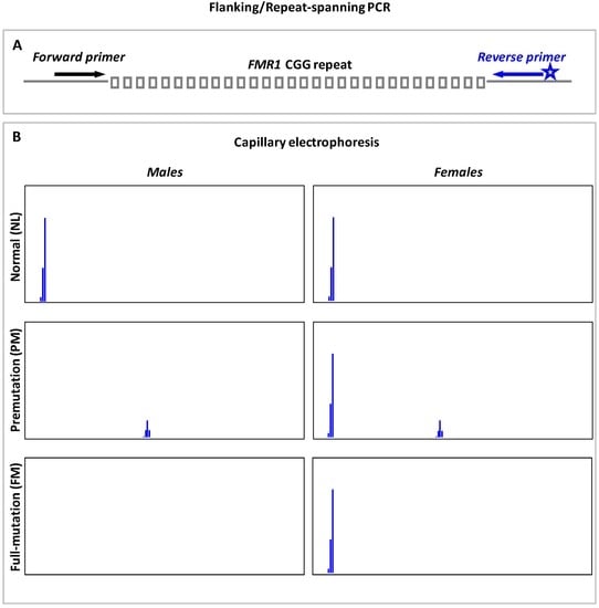 - Saluto, A.; Brussino, A.; Tassone, F.; Arduino, C.; Cagnoli, C.; Pappi, P.; Hagerman, P.; Migone, N.; Brusco, A. An enhanced polymerase chain reaction assay to detect pre- and full mutation alleles of the fragile X mental retardation 1 gene. J. Mol. Diagn. 2005, 7, 605–612. [Google Scholar] [CrossRef]
