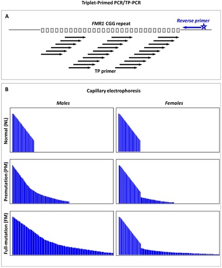 Triplet-Primed PCR or TP-PCR: (A) Schematic depicting the TP-PCR primer design; and (B) expected capillary electrophoresis profiles of normal, premutation and full-mutation males and females. For simplification, the Tail primer is not shown.