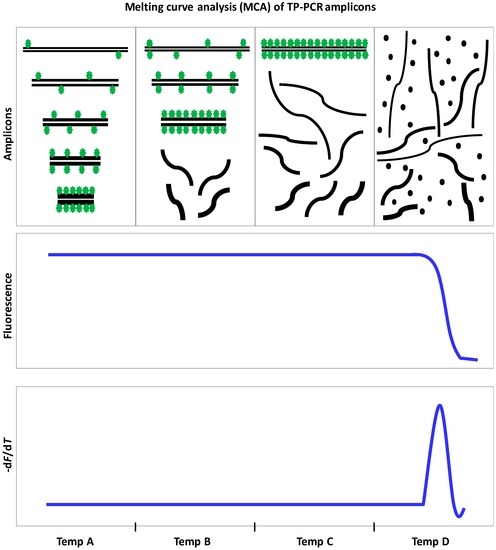 Melting curve analysis (MCA) of TP-PCR amplicons. Schematic illustrating how MCA of heterogeneous TP-PCR amplicons results in the generation of a single melt peak. Dissociation of double-stranded PCR products and re-distribution of SYBR Green I Dye from the shorter to larger fragments with gradually increasing temperature (Temp A to Temp C) is shown. At Temp D, when the largest amplicon strands dissociate, SYBR Green I is completely released and remains unbound to DNA, resulting in a sharp decrease in fluorescence. −dF/dT, first negative derivative of fluorescence versus temperature.