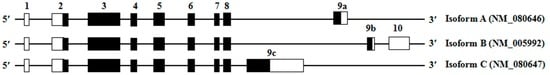 The human TBX1 gene has three isoforms that share exons 1–8 but differ in the terminal exons 9A, 9B/10, and 9C and comprises twelve exons that span approximately 27 kb on chromosome 22q11.21. The genomic structure of the TBX1 gene is illustrated in Figure 1. We identified a total of 31 genetic variants of the TBX1 gene in patients with schizophrenia and control subjects, including six common SNPs (rs737868, rs41298814, rs2301558, rs72646967, rs4819522, and rs5746826) with minor allele frequency (MAF) above 5% and 25 rare mutations with MAF below 5%. Six common SNPs were selected for genetic association analysis. The genotype and allele frequencies of these six SNPs are listed in Table 1. There is no significant deviation of these common SNPs from the Hardy–Weinberg equilibrium in either patient or control group except for rs72646967. However, there are no significant differences in the genotype or allele frequency of these common SNPs between patients with schizophrenia and control subjects (Table 1).