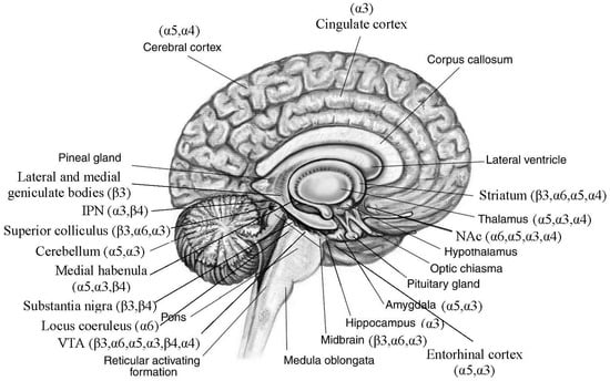 Additionally, the distribution of the nAChRs encoded by the replicated risk CHRNs reported in the literature is illustrated in Figure 1 (http://anatomy-bodychart.us/) [,,,,,,,,,,,,,,,,,,,,,,,,,].