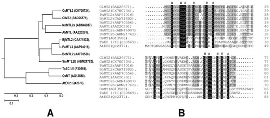 Amino acid sequences were deduced and analyzed using ProtParam []. The amino acid sequences of the MTs were compared with sequences in the Protein Data Bank (PDB) database and Conserved Domain Data Bank (CDD) using BLASTP []. Amino acid sequences were aligned using ClustalX with default parameters [].