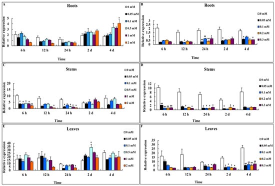 We analyzed the expression of CsMTL2 after periods of exposure to various levels of Zn2+ and Cd2+ stress. For the Zn2+ treatments, six-week-old cucumber plants were grown in soil supplemented with 0 (H2O control), 0.05, 0.1, 0.5, 1.0, and 2.0 mM ZnSO4. Whereas the expression of CsMTL2 was nearly unchanged in the control, except for a slight reduction at 24 h in the roots and leaves, and at 2 days in the stems, significant differences in expression were detected in stems during treatment (Student’s t-test, p < 0.01) (Figure 2A,C,E). In leaves, the expression of CsMTL2 was upregulated at 2 days of Zn2+ treatment (Figure 2E). In roots, CsMTL2 was downregulated at 6, 1, and 24 h and upregulated at 2 and 4 days of Zn2+ treatment (Figure 2A). The expression pattern of CsMTL2 in stems was quite different from that in leaves and roots (Figure 2C). CsMTL2 was downregulated at nearly all time points in response to different concentrations of Zn2+, especially at 6, 12, and 24 h of treatment (Figure 2C).