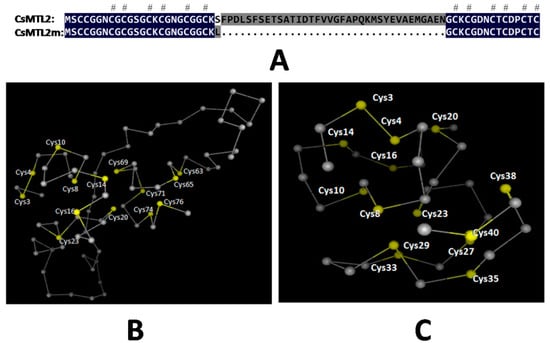 One of the most important characteristics of plant MTs is the presence of spacer regions, which are also referred to as linkers. These regions, which are devoid of Cys residues, connect individual domains with metal-thiolate clusters []. An analysis of the topology of SbMT-2 showed that this protein contains N-terminal and C-terminal motifs joined by a β-strand and an α-helix element []. The 3D structures of MTs are generally depicted with bound metal ions. It is possible to predict the 3D structures of MTs based on their sequences after resolving the correlation between cluster formation and folding in these proteins. We produced the CsMTL2m peptide, which is a truncated version of CsMTL2 consisting of 41 amino acids and a predicted molecular mass of 3.895 kDa (pI 7.92), and containing both the N- and C-terminal regions of CsMTL2, but lacking the linker domains located at amino acids 1–24, 29, and 61–77 of CsMTL2 (Figure 3A). We found that the 3D structures of CsMTL2 and CsMTL2m are quite different (Figure 3B,C), based on SWISS-MODEL analysis [].