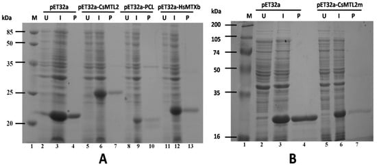 Sodium dodecyl sulfate-polyacrylamide gel electrophoresis (SDS-PAGE) analysis of Trx-CsMTL2, Trx-Pcl, Trx-HsMTXb, and Trx-CsMTL2m fusion protein heterologously expressed in E. coli. (A) Lane 1, molecular weight markers; lanes 2–13, proteins isolated from the transformed cells (pET32a (+), pET32a-CsMTL2, pET32a-PCL and pET32a-HsMTXb). U: before isopropyl-β-D-thiogalactopyranoside (IPTG) induction; I: IPTG induction; P: purified protein. (B) Lane 1, molecular weight markers; lanes 2–7, proteins isolated from transformed cells (pET32a (+) and pET32a-CsMTL2m).