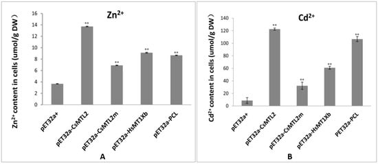 Metal ion accumulation in transgenic E. coli. Comparison of zinc (Zn) and cadmium (Cd) ion accumulation after 3 h of Zn2+ (A) and Cd2+ (B) ion treatment in E. coli cells heterologously expressing CsMTL2, CsMTL2m, HsMTXb, and PCL. The error bars represent standard errors of the mean from at least three independent experiments. Statistical significance was based on a Student’s t-test **: p < 0.01. DW: dry weight.