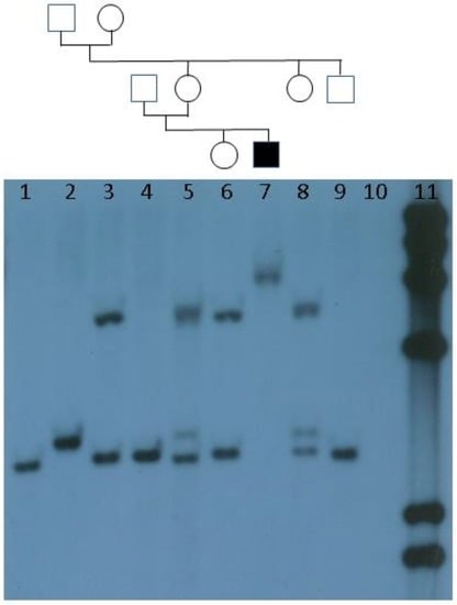 Southern blot of FMR1 repeat showing inheritance of premutation from normal transmitting male (lane 2) to two daughters (lanes 5 and 8) and expansion to full mutation in grandson (lane 7). Lane 11: λHindIII marker.