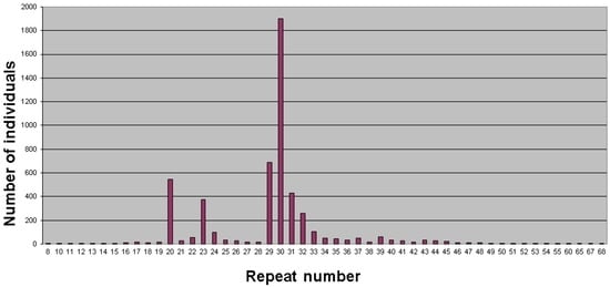The range of repeat size alleles in the normal population varies little between most ethnic groups studied; the distribution for a UK population is shown in Figure 2. The frequency of alleles at the upper end of the normal range (40 repeats and above), combined with empirical observations of stability, helps to determine the most suitable upper limit of “normal,” which is usually quoted either as 45 or 46 repeats. There is, however, no absolute and rigid demarcation between normal, intermediate and premutation allelic states, but rather a statistical gradation of probability of expansion which depends not only on size but also upon other factors, such as the number and position of interspersed AGG repeats, the longest uninterrupted CGG tract, and flanking haplotype [24,25,26,27,28,29].