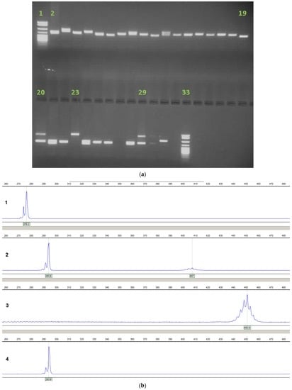 (a): FMR1 PCR run on a 1.7% agarose gel (for method, see reference [38]). Lanes 2–19: Normal alleles; lanes 20, 23, 29: Premutations; lanes 1, 33: pBR322MspI size marker; (b): FMR1 PCR analysed on an ABI3130TM (Applied Biosystems, Foster City, CA, USA) automated sequencer. Panel 1: Male, 23 repeats; Panel 2: Female, 30 and approx. 72 repeats; Panel 3: Male, approx. 89 repeats; Panel 4: Male, 30 repeats.
