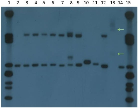 Southern blot of FMR1 repeat using BstZI/EcoRI digest and StB12.3 probe. Lanes 2 and 14: Normal males; lanes 3–7, 9 and 12: Normal females; Lane 8: Premutation female; Lane 10: Premutation male; Lane 11: Intermediate male; Lane 13: Mosaic male (premutation and full mutation arrowed); Lanes 1 and 15: λPstI marker.