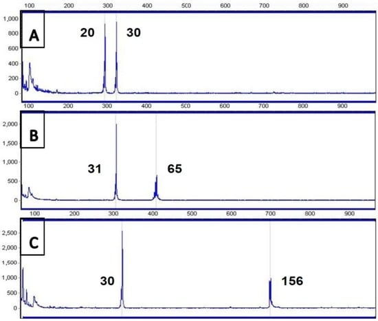 Electropherograms of CGG repeat amplification with AmplidexTM kit in females. Panel A: normal alleles (20 and 30 CGG repeats). Panel B: mid-sized premutation carrier (31 and 65 CGG repeats). Panel C: large premutation carrier (30 and 156 CGG repeats).