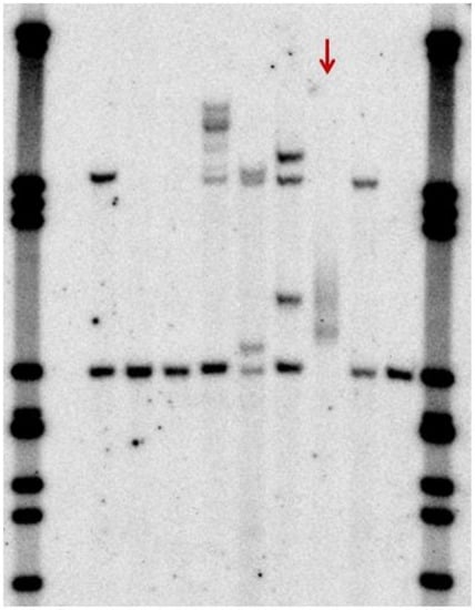 Southern blot showing male with unmethylated mosaic expansion (arrowed). The expansion size ranges from approximately 0.32–0.87 kb above normal size.