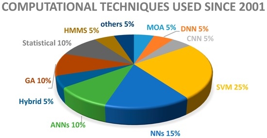 Computational techniques (percentage) used since 2001. MOA: Massive online analysis, DNN: Deep neural network, CNN: Convolutional neural network, SVM: Support vector machine, NNs: Neural networks, ANN: Artificial neural Networks, GA: Genetic algorithm, HMMs: Hidden Markov Model.