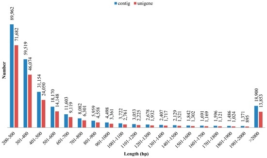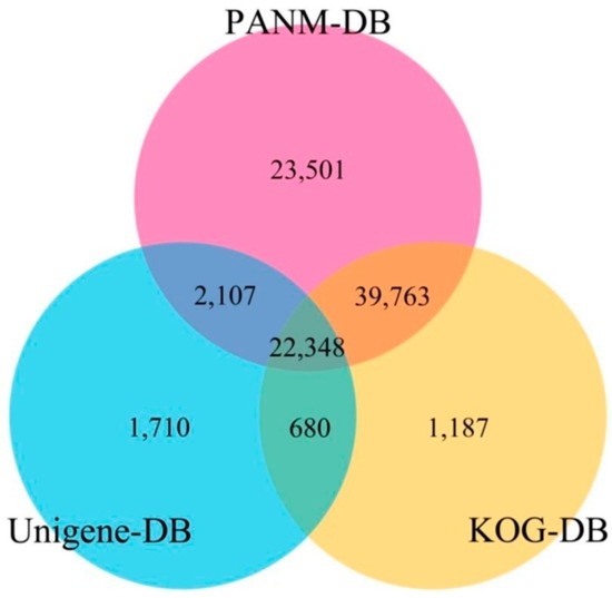 - Haas, B.J.; Papanicolaou, A.; Yassour, M.; Grabherr, M.; Blood, P.D.; Bowden, J.; Couger, M.B.; Eccles, D.; Li, B.; Lieber, M.; et al. De novo transcript sequence reconstruction from RNA-seq using the Trinity platform for reference generation and analysis. Nat. Protoc. 2013, 8, 1494–1512. [Google Scholar] [CrossRef] [PubMed]