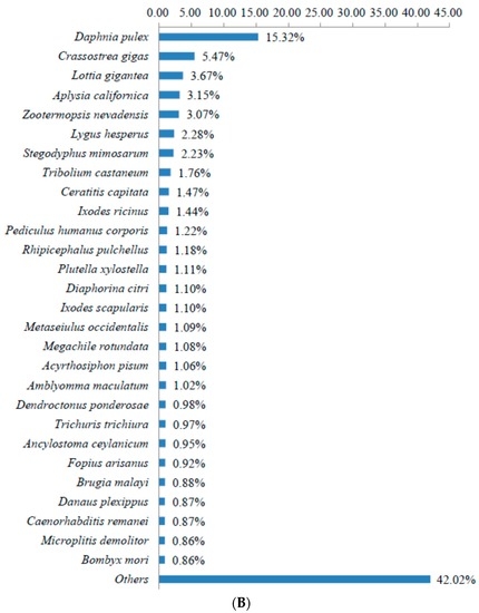 - Lv, J.; Liu, P.; Gao, B.; Wang, Y.; Wang, Z.; Chen, P.; Li, J. Transcriptome analysis of the Portunus trituberculatus: De novo assembly, growth-related gene identification and marker discovery. PLoS ONE 2014, 9, e94055. [Google Scholar] [CrossRef] [PubMed]