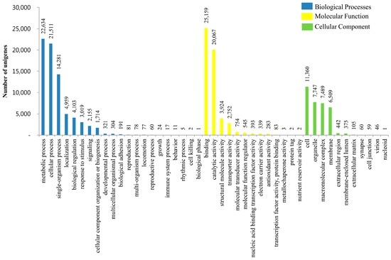 - Ye, J.; Fang, L.; Zheng, H.; Zhang, Y.; Chen, J.; Zhang, Z.; Wang, J.; Li, S.; Li, R.; Bolund, L.; et al. WEGO: A web tool for plotting GO annotations. Nucleic Acids Res. 2006, 34, W293–W297. [Google Scholar] [CrossRef] [PubMed]