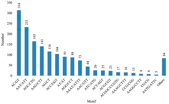 - La Rota, M.; Kantety, R.V.; Yu, J.K.; Sorrells, M.E. Nonrandom distribution and frequencies of genomic and EST-derived microsatellite markers in rice, wheat, and barley. BMC Genom. 2005, 6. [Google Scholar] [CrossRef] [PubMed]
