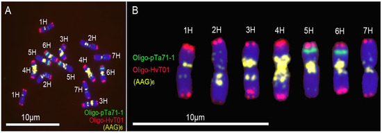 Repetitive DNA sequences including (AAG)n, HVT01 and pTa71 have been previously used as probes to analyze barley chromosomes by FISH methods [10,15,24,25,26]. These repetitive DNA sequences are useful in investigating the chromosomal structure of barley germplasm [10,15,24,25,26]. In earlier studies, the procedure of the preparation of probes HVT01 and pTa71 was time-consuming because it involved denaturing the DNA of the chromosome spreads and also that of the labeled probes. Our new non-denaturing FISH method has vastly simplified the hybridization technique but still retains the reliability and accuracy of chromosome identification. In the present study, Oligo-pTa71-1 and Oligo-HvT01 showed the same signal patterns as pTa71 and pMD-HvT01, respectively, on the chromosomes of some barley varieties (Figures S9 and S10). Therefore, oligonucleotide probes Oligo-HvT01 and Oligo-pTa71-1 appear to have the same roles as HVT01 and pTa71 in distinguishing the chromosomes of some barley varieties. Use of these oligonucleotides as probes for ND-FISH analysis of some barley chromosomes is much more convenient than the earlier procedure.