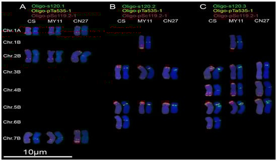 Oligo-s120.1 (green), Oligo-s120.2 (green) and Oligo-s120.3 (green) combined with Oligo-pTa535-1 (yellow) and Oligo-pSc119.2-1(red) were used as probes for ND-FISH analysis of root tip metaphase chromosomes of wheat varieties Chinese Spring (CS), Mianyang 11 (MY11), and Chuannong 27 (CN27): (A) Oligo-s120.1 hybridization patterns; (B) Oligo-s120.2 hybridization patterns; and (C) Oligo-s120.3 hybridization patterns. Only the chromosomes with strong or clear signals of Oligo-s120.1, Oligo-s120.2 or Oligo-s120.3 were cut and pasted. Chr.: chromosome. Chromosomes were counterstained with DAPI (blue).