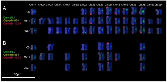 Oligo-275.1 produced hybridization signals on 1A, 7A, 2D and all the B-genome chromosomes of CS, on 1D, 2D and all the A- and B-genome chromosomes of MY11, and on 1A, 3A, 4A, 5A, 6A, 7A, 1D, 2D and all the B-genome chromosomes of CN27 (Figure 3A; Figure S4). It should be noted that signal patterns of Oligo-275.1 on the long arms of 5A chromosomes (5AL) of MY11 and CN27 are different. The signals of Oligo-275.1 on 5AL arms of MY11 are located at the sub-telomeric regions, however, on the 5AL arms of CN27, the signals are located at pericentromeric sites (Figure 3A; Figure S4). The hybridization signals of Oligo-275.2 could be observed on chromosomes 1A, 3A, 7A, 2B, 3B and 7B of CS, on chromosomes 1A, 2A, 3A, 5A, 7A, 2B, 3B, 4B and 7B of MY11, and on the chromosomes 1A, 5A, 7A, 2B, 3B and 7B of CN27 (Figure 3B; Figure S5). Again, it can be noted that the signal patterns of Oligo-275.2 on the 5A chromosomes between MY11 and CN27 are different (Figure 3B; Figure S5). No hybridization sites of Oligo-275.2 could be observed on 5AL arms of CN27, but the signals appeared on the 5AL arms of MY11 (Figure 3B; Figure S5). The hybridization patterns of Oligo-275.1 on chromosome of CS are similar with the ones of pTa-275 [7].