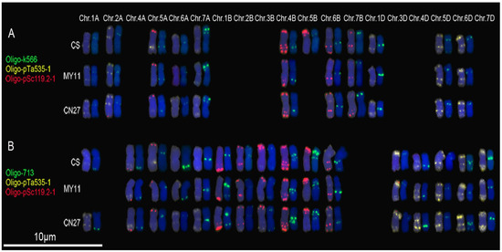 Oligo-k566 (green) and Oligo-713 (green) combined with Oligo-pTa535-1 (yellow) and Oligo-pSc119.2-1 (red) were used as probes for ND-FISH analysis of root tip metaphase chromosomes of wheat varieties CS, MY11 and CN27: (A) Oligo-k566 hybridization patterns; and (B) Oligo-713 hybridization patterns. Only the chromosomes with strong or clear signals of Oligo-k566 or Oligo-713 were cut and pasted. Chr.: chromosome. Chromosomes were counterstained with DAPI (blue).
