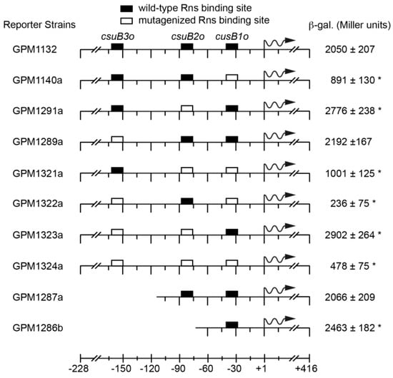 Sequence analysis of each binding site revealed that each contains 12 bp sequences with a similarity to previously reported Rns binding sites (Figure 3) [,,,,]. These consensus-like sequences are centered at −34.5, −80.5, and −155.5 with respect to the Rns-dependent transcription start site of csuBp. Because Rns binding sites are not palindromic, Rns binding site motifs may appear on either DNA strand []. For sites csuB1o and csuB3o, the conserved motifs are found on the coding strand (Figure 3). In contrast, the motif is present on the noncoding strand within site csuB2o. To analyze the function of these sites in vivo, each was subjected to oligonucleotide-directed mutagenesis to alter one or more nucleotides within the 12 bp motifs (Figure 3). The number and position of each mutation was determined by the sequence of selected endonuclease restriction sites (SpeI within csuB1o, KpnI within csuB2o, and AgeI within csuB3o), the generation of which facilitated screening for mutagenized binding sites. The resulting constructs were cloned into Lac reporter plasmids which were subsequently integrated into the attBHK022 site of MC4100 so that the function of each binding site could be evaluated in vivo (Table 1).