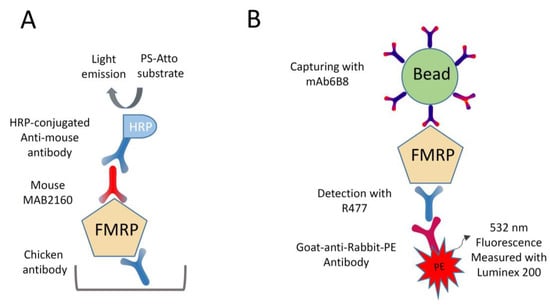 Capture immunoassays for Fragile X Mental Retardation Protein 1 (MRP) quantification. (A) Chemilunescent sandwich Enzyme-Linked ImmunoSorbent Assay (ELISA). FMRP was captured by the anti-FMRP chicken antibody and detected by the mouse monoclonal antibody MAB2160 (Table 1). After incubation with horseradish peroxidase-conjugated anti-mouse Ig (HRP), FMRP levels were assessed in a luminometer by measuring light emitted from the horseradish PS-Atto substrate; and (B) Luminex-based capture immunoassay. FMRP was captured by mAb6B8-coated beads and detected by the rabbit antibody R477. After incubation with a goat anti-rabbit Immunoglobulin G (IgG) conjugated to phycoerythrin (PE), FMRP levels were assessed with a Luminex 200 system by measuring PE fluorescence.