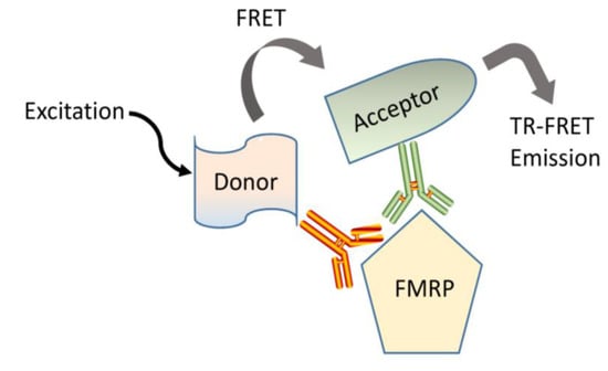 Two laboratories have reported the development and characterization of assays that employ time-resolved fluorescence resonance energy transfer technology (TR-FRET) to quantify FMRP [,]. These immunoassays utilize the simultaneous binding of a pair of fluorophore-labeled antibodies recognizing two close epitopes of the target protein. One antibody carries a donor dye (europium cryptate or Lumi4-Tb cryptate) capable to be excited and transfer resonance energy to the acceptor dye d2 attached to the second antibody (Figure 2). Once the donor and acceptor fluoropheres are brought in close proximity to each other by the antibodies’ binding, a unique detectable fluorescent signal is generated. These immunoassays require small amount of sample, are run by incubating the labeled antibodies simultaneously to the analytes, involve simple one-step protocols that do not require separation steps, and are suitable to micro-plate high-throughput screening [].