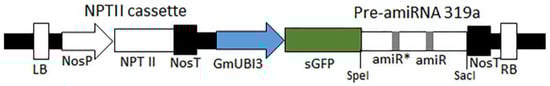 To construct the pUFamiR vector for amiRNA-mediated gene silencing in legume roots (Figure 1), a 918 bp fragment of the soybean polyubiquitin (GenBank: EU310508.1) promoter (GmUbi) [26] flanked by NotI and BamHI restriction sites was amplified via PCR from soybean genomic DNA (cultivar “Fayette”) and cloned into a modified pBI121 construct. The superfolder green fluorescent protein (sGFP) gene from HBT–sGFP–NOS construct (kind gift from Jen Sheen, Massachusetts General Hospital) was mutagenized via PCR to remove its stop codon and to flank the gene with BamHI and XbaI sites. The gene was then cloned into the pBI121 vector to yield the pUF construct. The pre-amiRNA containing miR319a of Arabidopsis thaliana was cloned from pRS300, which was a gift from Detlef Weigel (Addgene plasmid # 22846) [27,28].