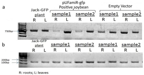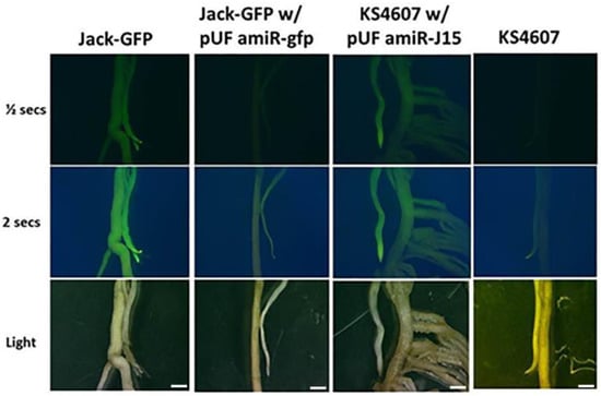 The ability of the pUFamiR vector to induce silencing was confirmed by targeting the sGFP gene in a constitutively expressed soybean event previously engineered [38]. The loss of GFP expression in plant roots after transformation with the pUFamiR–gfp construct was observed as expected (Figure 2, second column). The abundance of sGFP mRNA was significantly reduced in root tissues as shown in RT-PCR (Figure 3). On the other hand, the amiR–gfp produced in the hairy roots did not appear to migrate to nontransformed tissue of the seedling. The sGFP mRNA levels in leaves showed no difference between pUFamiR–gfp-inoculated plants and controls. The fusion sGFP protein expressed by the pUFamiR vector was functional as demonstrated by GFP fluorescence on hairy roots of the nontransgenic cultivar, KS4607. Using the pUFamiR–J15 construct, GFP fluorescence was observed within the transformed hairy roots due to the GFP reporter in the construct (Figure 2, third column).