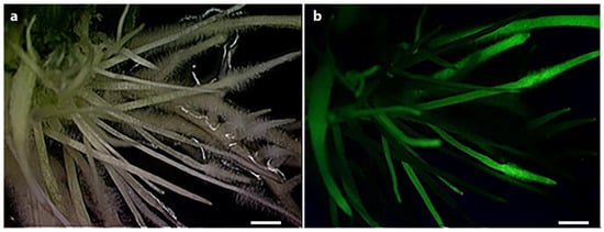 To select expressed constructs in hairy roots, a fluorescent sGFP gene was cloned on the upstream region of pre-amiRNA sequences as visible marker for selection (Figure 1). As shown in Figure 4, the transgenic growing roots in the selection medium presented strong fluorescence under the blue light, indicating the constructs were successfully expressed. It is always expected that a portion of roots generated from chimeric plants do not carry the designed gene constructs [41].