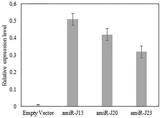 The stem-loop RT-qPCR confirmed the expression of amiR-J15, amiR-J20, and amiR-23 in the hairy roots but not in the hairy roots with empty vector. All three amiRNAs were not detected in the empty vector. Error bars represent the standard error of the mean for three experiments and three biological replicates per experiment, with experiment treated as a random effect.