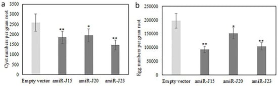 Bioassays were conducted by transplanting composite plants independently transformed with pUFamiR-J15, pUFamiR-J20, and pUFamiR-J23 into soil uniformly infected with H. glycines to detect whether any suppression of H. glycines development and/or reproduction occurred on transgenic hairy roots. All transformations of the composite plants were verified by PCR analysis. Visual inspection of the roots at the completion of the bioassays revealed differences between negative controls and transgenic roots (Figure 6). Control plants with the empty pUFamiR vector had mean values 2582 cysts per gram root (493 cysts per plant), and 197,521 eggs per gram root (36,525 eggs per plant). Reductions of 28% and 43% in numbers of cysts per gram root were observed for amiR-J15 lines and amiR-J23 lines, respectively, compared with control plants (p < 0.01) (Figure 7a). The amiR-J20 plants reduced cyst densities by 24%, however, there was less evidence of an effect for this construct (p = 0.017). Similar results were obtained for egg densities, with amiR-J20 plants showing the smallest reduction of 23% (p = 0.0204), while the amiR-J15 and amiR-J23 lines produced reductions of 53% and 47% (p < 0.01), respectively (Figure 7b).