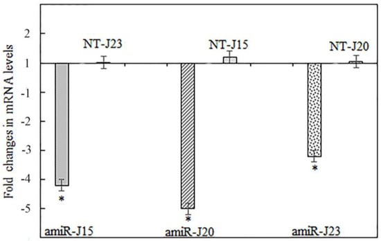 To confirm the expression and accumulation of designed amiRNAs, the stem-loop RT-qPCR was performed for all positive transgenic hairy roots. It has been shown to provide better specificity and sensitivity for small RNA quantitation [31,32]. The results (Figure 5) indicated the mature miRNAs had significantly accumulated in the transgenic hairy roots. The amiR-J15 had relatively high expression compared to the other two constructs in the soybean hairy roots.