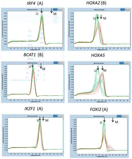 For a number of amplicons, amplification from the bound fraction occurred with a substantial delay relative to that from the unbound fraction (Table 1), a delay of about 4 to 7 cycles indicating 16 to 120-fold depletion. For example, the Cp for amplification of IKZF1 amplicon C in the bound fraction was 37.68, while that for the unbound fraction was 31.17. This difference of 6.51 cycles indicates that the IKZF1 DNA captured in the bound fraction was about 1/100 that in the unbound. Melt curve analyses of the amplified DNA were further used to characterize the methylation status of target regions. Compared with methylated and unmethylated controls, IKZF1 amplicon C DNA amplified from the bound fraction was identical to that of unmethylated DNA, indicating that the low-level amplification was likely due to background non-specific capture of DNA in the methylated DNA binding domain-capture (MBD-Cap) protocol. In other cases, however, the captured DNA showed clear evidence of containing methylated sequences. For example, the MBD-Cap bound fraction of FOXI2 region B shows a clear mix with peaks representing unmethylated sequences and methylated sequences (Figure 2). For HOXA2 region B, the bound fraction shows a melt curve indicative of a mix of fully methylated and partially methylated molecules (Figure 2).