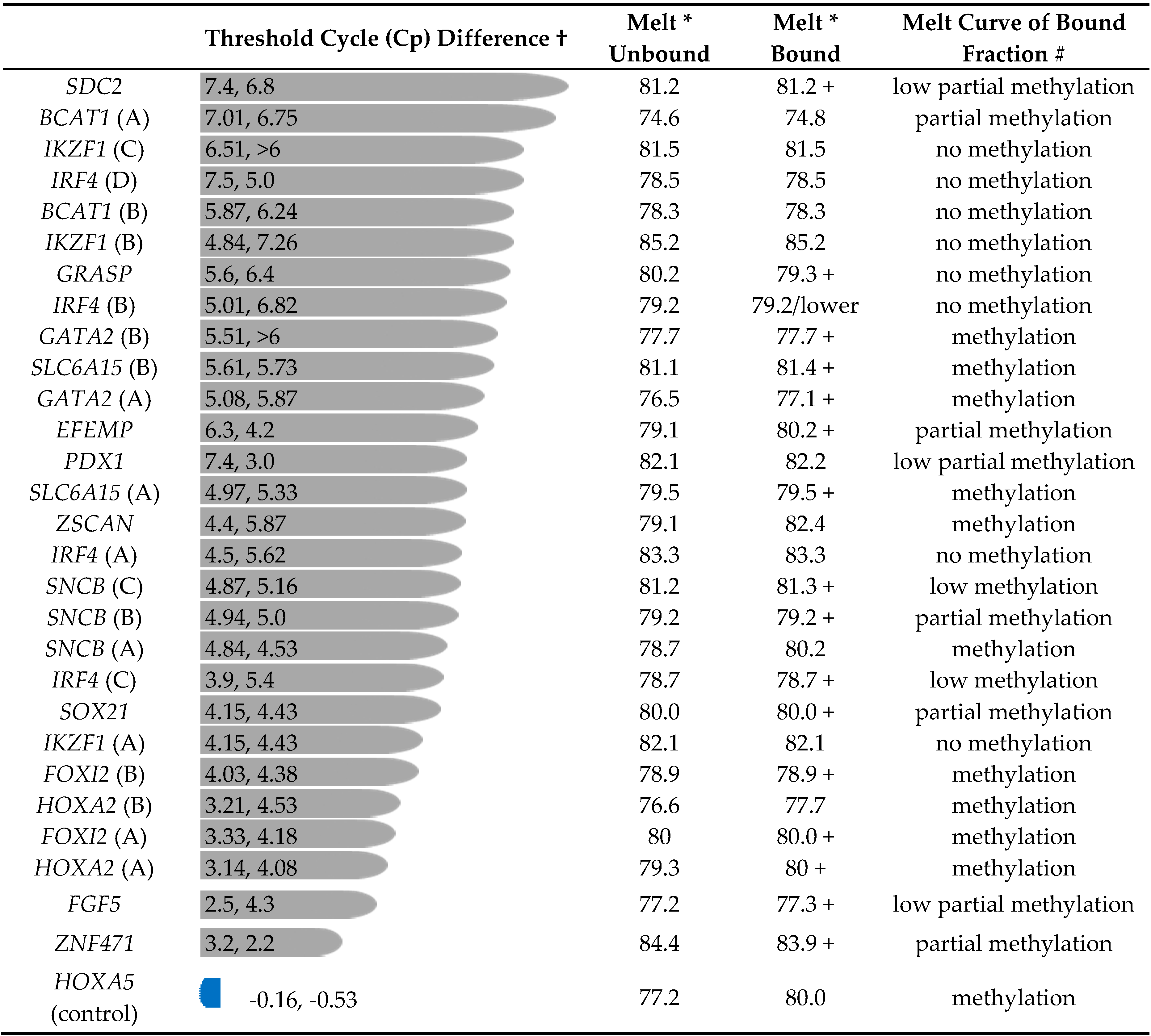The degree of enrichment (or lack thereof) of methylated DNA sequences was estimated by comparison of the Cp values for amplification from the bound and unbound fractions. Amplicon 1 of HOXA5 was included as a control, and the presence of significant methylation in WBC DNA had been shown. For HOXA5, amplification from the bound (methylated) DNA fraction occurred with a Cp slightly ahead of the unbound fraction (Table 1). This indicates that most sequences of this HOXA5 region had been captured in the methylated fraction. Melt curves confirmed that the captured DNA was methylated and the most of the non-captured DNA unmethylated (Figure 2).