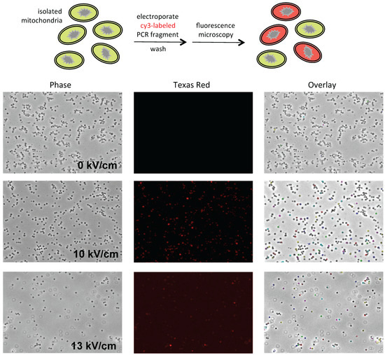 Uptake of cy3-labeled DNA into isolated mitochondria upon electroporation: (Top) Schematic representation of the experiment; and (Bottom) (left) phase contrast images of purified mitochondria incubated with a 847 bp cy3-labeled PCR fragment without (0 kV/cm) or with electroporation at either 10 kV/cm or 13 kV/cm; (center) visualization of cy3 fragment uptake via fluorescence microscopy; and (right) overlay of the fluorescent signals (shown in color) onto the respective phase images.