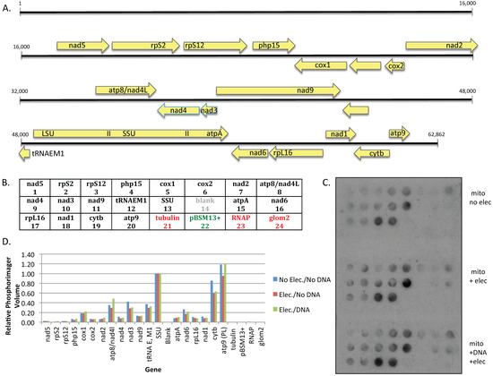 Transcription of endogenous genes is not altered by electroporation: (A) Transcript map of the genes probed in dot blot experiments using gene designations from [7]. (B) Grid positions of immobilized PCR fragments; (C) Dot blots probed with labeled RNA synthesized by: mitochondria before electroporation (top); mitochondria after electroporation in the absence of exogenous DNA (middle); and mitochondria after electroporation in the presence of exogenous DNA (bottom). (D) Quantification of the data in (C) showing relative expression levels of individual genes under each of the three conditions.