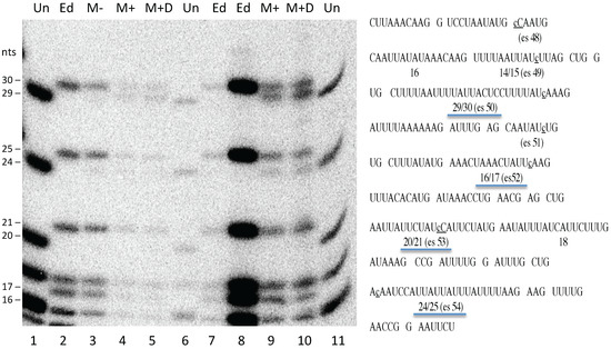 The presence of fully edited mitochondrial transcripts precludes assaying editing of newly synthesized RNA from endogenous genes via bulk RNA analysis, necessitating the use of labeling strategies. Transcripts were labeled under the same conditions used for the dot blot experiments, mitochondria were pelleted and total RNA was isolated with Zymo Spin IIC (Zymo Research, Irvine, CA, USA) columns. S1 nuclease protection and RNase T1 digestions were carried out as described by [34], using single stranded DNA complementary to the 3′ portion of the atpA mRNA as described in [17].