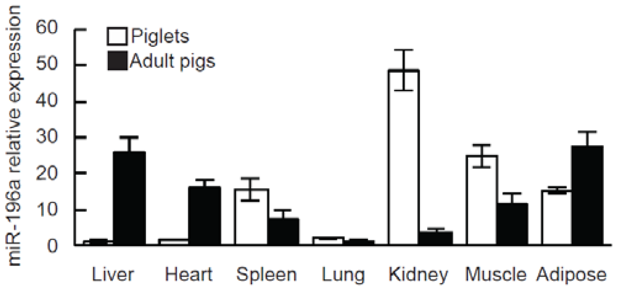 Ning, X.; Liu, S.; Qiu, Y.; Li, G.; Li, Y.; Li, M.; Yang, G. Expression Profiles and Biological Roles of miR-196a in Swine. Genes 2016, 7, 5. https://doi.org/10.3390/genes7020005