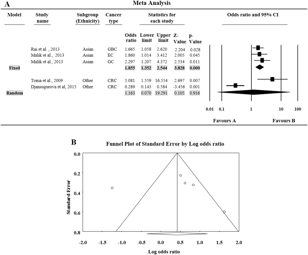 The minor allele frequency (MAF) for rs714 SNP varies from 28% to 38% (Table 2). For rs714 A > G polymorphism, none of the genotypic combination was found to affect the risk of overall cancer compared with the wild genotype. Since there are only five studies we did not perform subgroup analysis except for ethnicity. In Asian subgroups, having three studies with a total number of 649 multiple cancer cases and 650 controls, all the four genotypic model were found to significantly associated with increased risk of cancer (A vs. G: OR = 1.41, 95% CI = 1.20–1.66, p ≤ 0.000; AA vs. GG: OR = 1.86, 95% CI = 1.35–2.54, p ≤ 0.000; GA vs. GG: OR = 1.43, 95% CI = 1.11–1.85, p = 0.005; GA + AA vs. GG: OR = 1.66, 95% CI = 1.31–2.09, p ≤ 0.000; AA vs. GG + GA: OR = 1.52, 95% CI = 1.14–2.03, p = 0.004, Figure 2A.