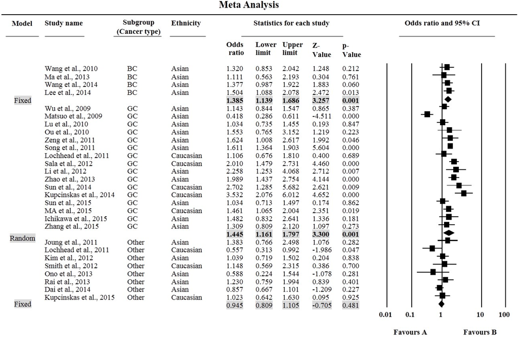 Data including first author name, year of publication, country of origin, ethnicity, genotyping methods, cancer types, frequency of cases and controls, genotype frequency, minor allelic frequencies, etc., were extracted from each study. If identical data were reported in more than one publication or had previously been reported somewhere else, only the original report with the largest sample size was included. Articles covering different ethnic groups and different countries or different cancer were viewed as different studies for each category cited above. Subgroup analysis, stratified by cancer type and ethnicity was also performed. Those cancer types appeared in only one or two studies, were placed into the “other cancers” subgroup. Ethnicity was classified as Caucasian, Asian and Mixed.