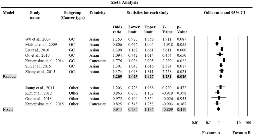 | 14 | Li et al., 2012 | [46] | China | Asian | GC | 300/300 | 0.65 | 0.26 | MASS-ARRAY IPLEX |