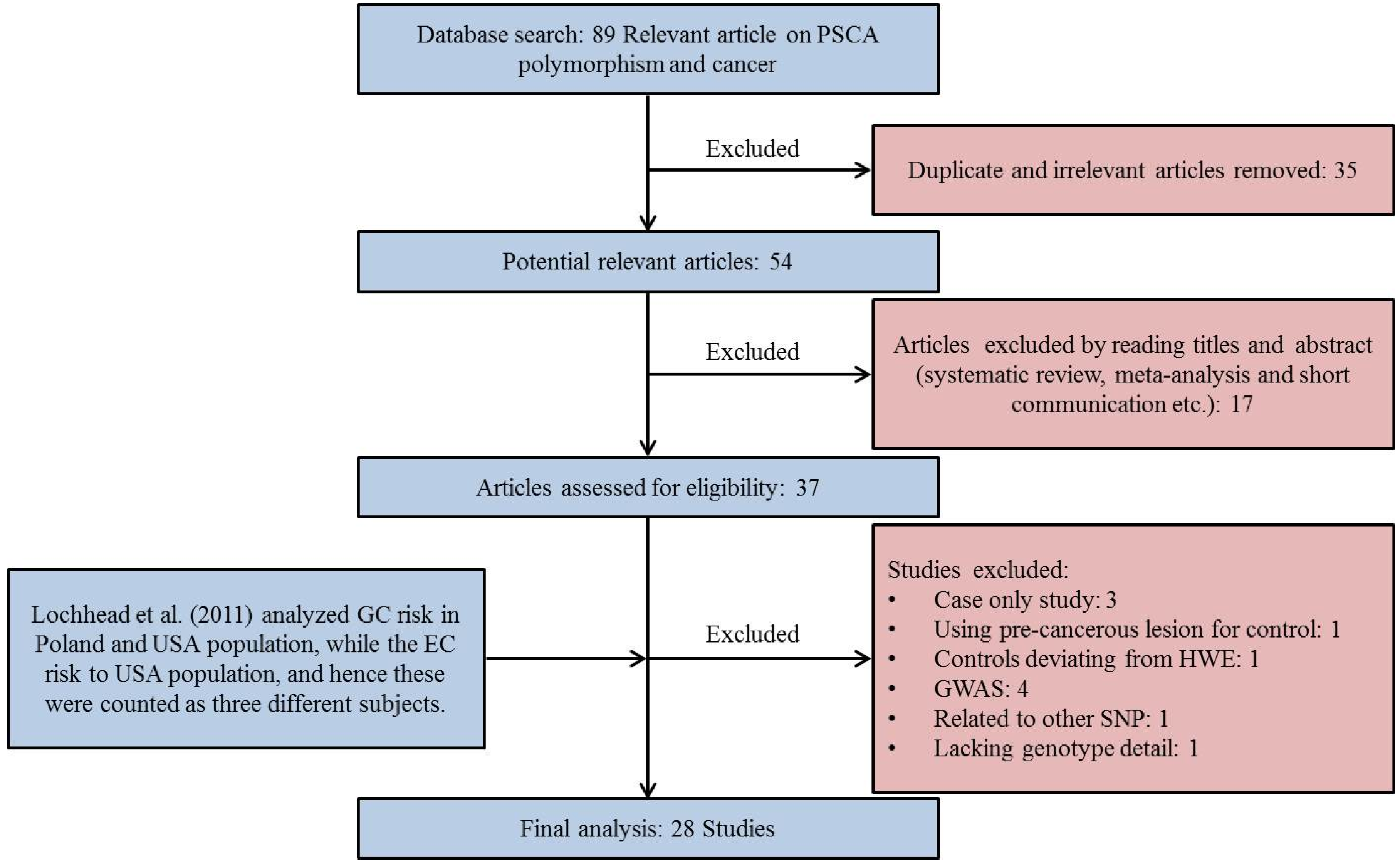 The major exclusion criteria were as follows: (1) ecological studies, case reports, reviews, abstract, comment and editorials; (2) articles published in a language other than English; (3) lack of control population; (4) studies with benign, hyperplasia or other related pre-malignant taken as controls; (5) insufficient data; (6) duplicate studies; (7) not for cancer research; (8) not in accordance with Hardy-Weinberg equilibrium in control groups.