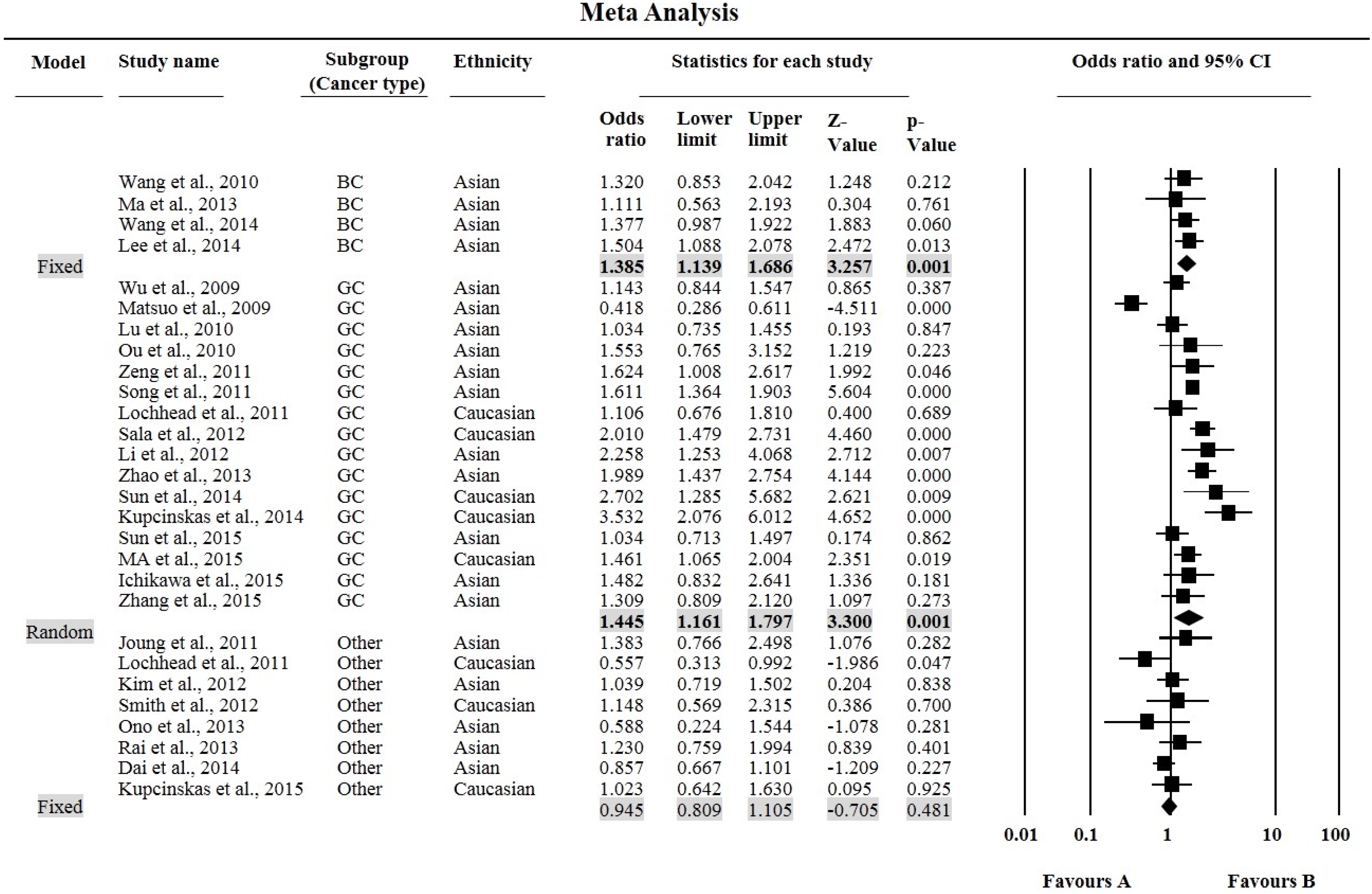Data including first author name, year of publication, country of origin, ethnicity, genotyping methods, cancer types, frequency of cases and controls, genotype frequency, minor allelic frequencies, etc., were extracted from each study. If identical data were reported in more than one publication or had previously been reported somewhere else, only the original report with the largest sample size was included. Articles covering different ethnic groups and different countries or different cancer were viewed as different studies for each category cited above. Subgroup analysis, stratified by cancer type and ethnicity was also performed. Those cancer types appeared in only one or two studies, were placed into the “other cancers” subgroup. Ethnicity was classified as Caucasian, Asian and Mixed.
