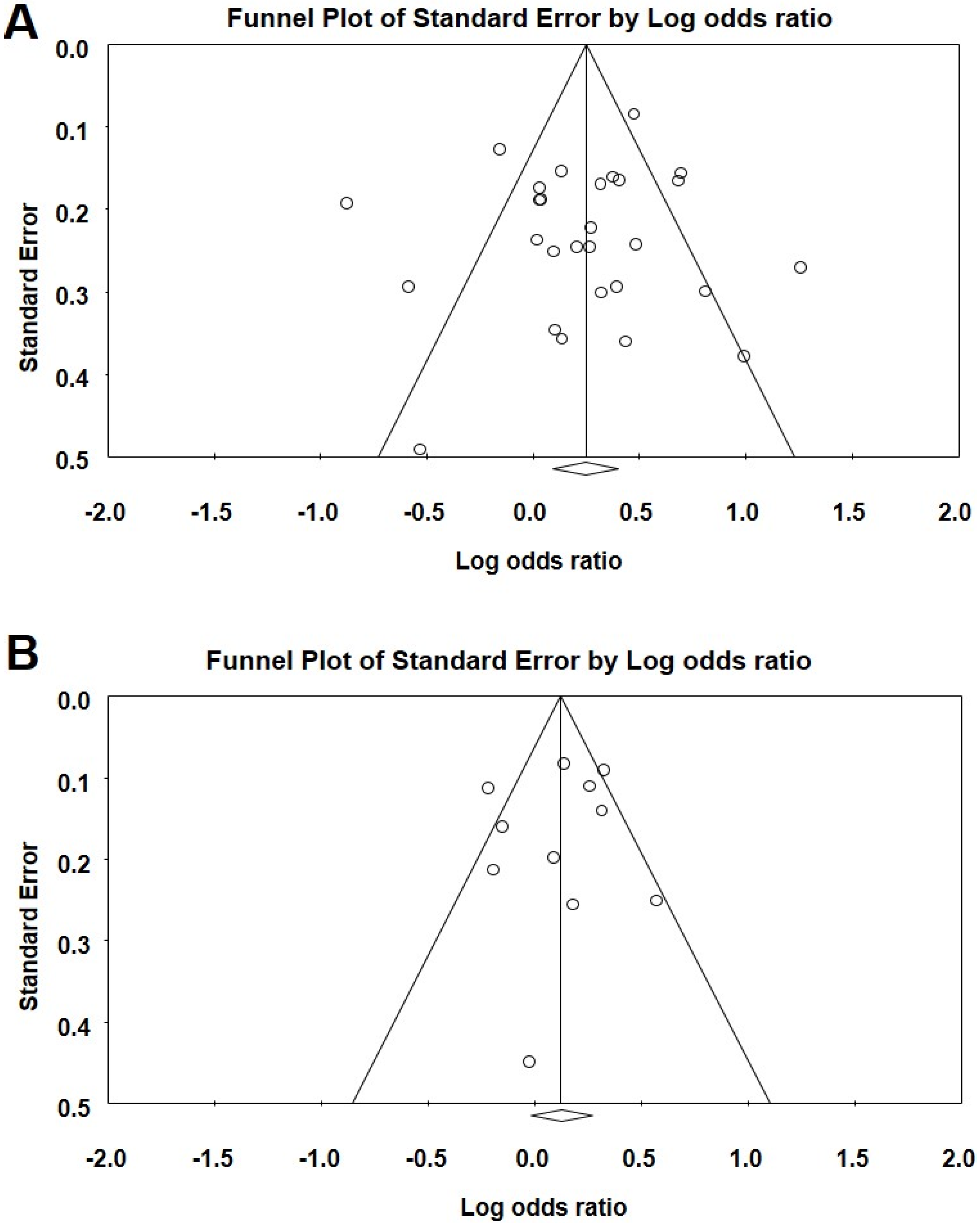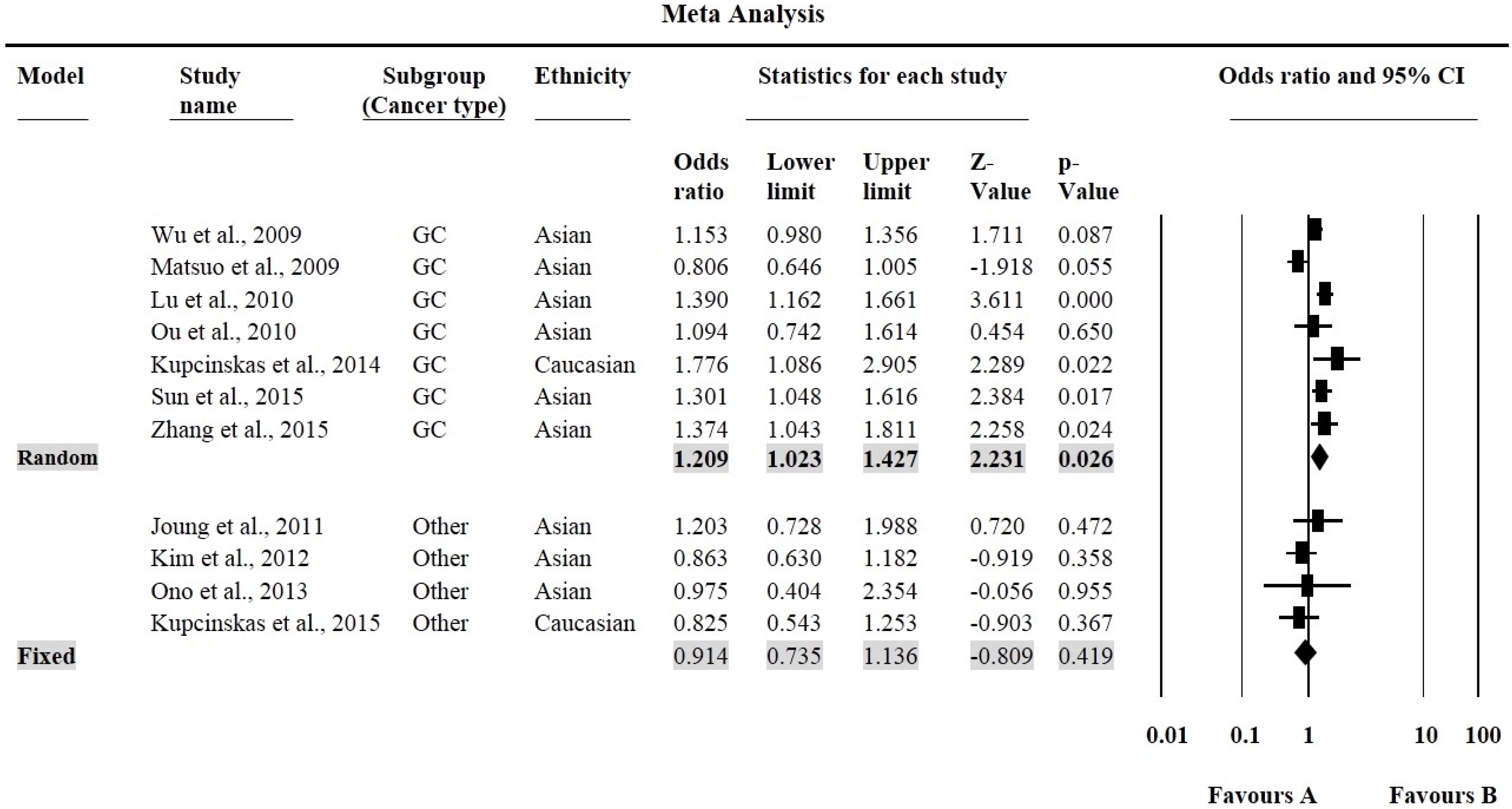 The intensity level of association between studied SNPs and cancer susceptibility was assessed by computing crude ORs and corresponding 95% CI. The pooled ORs was estimated for allele contrast, log-additive, dominant, and recessive models. Deviation from HWE was analyzed by using the Chi-square goodness of fit test (significant at the 0.05 level). The analyses were stratified on the basis of cancer types (gastric cancer/GC, bladder cancer/BC and others) and ethnicity (Asian and Caucasian). Chi-square-based Q statistics was calculated to evaluate the heterogeneity across the studies, and it was considered significant at p < 0.05. Heterogeneity was measured using the I2 value, the percentage of variation across studies that are due to heterogeneity rather than chance. The value of I2 = 0%, 25%, 50% and 75% represent no observed heterogeneity, low, moderate, and high heterogeneity, respectively [30]. The pooled ORs were calculated by the fixed-effect model in case of no heterogeneity [31] otherwise, a random-effect model was used [32]. Moreover, a sensitivity analysis was performed to check if the alteration of inclusion criteria affects the results of the meta-analysis. For this, the meta-analysis estimates were computed after excluding one study at a time. The publication bias was assessed graphically using Funnel plot, and the plot asymmetry was investigated by Egger test [33] and p < 0.05 was considered as statistically significant publication bias. All of the statistical analyses were done by Comprehensive Meta-analysis software (Version 2.0, BIOSTAT, Englewood, NJ, USA).
