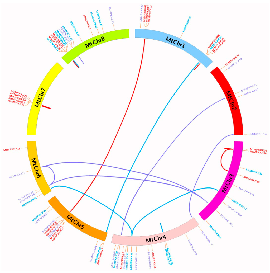 3.3. Chromosomal Location and Duplication Analysis of MtMAPKKK Genes