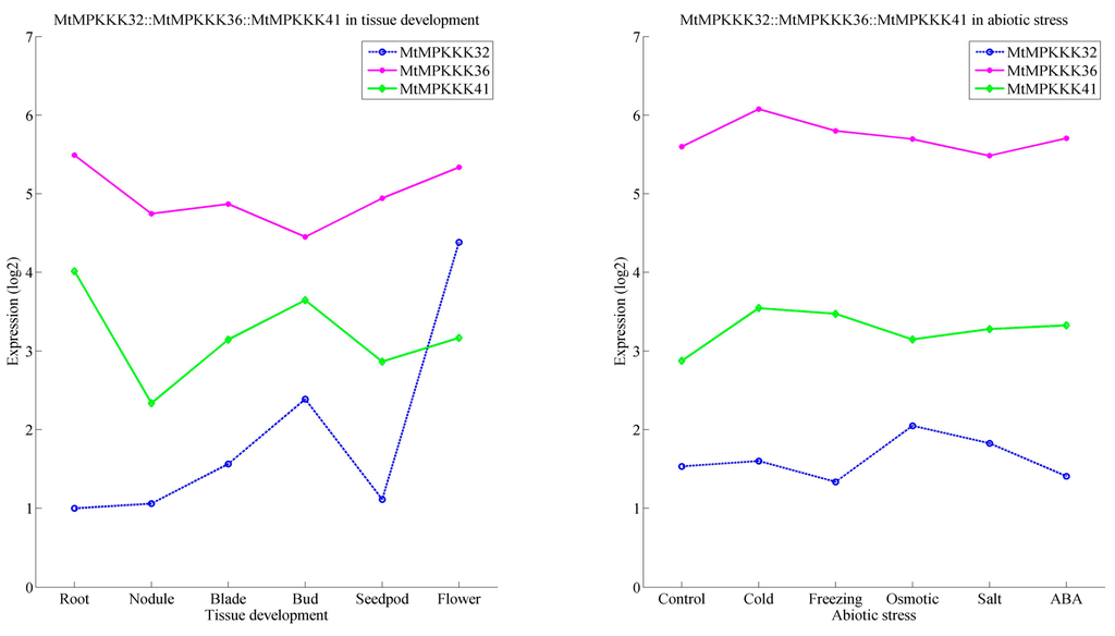 3.5. Expression Analysis of MtMAPKKK Genes in Response to Abiotic Stresses