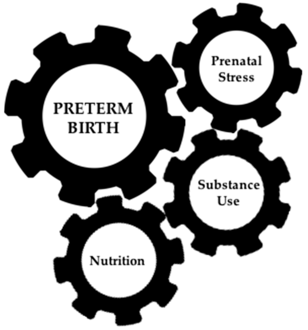 Mechanisms contributing to PTB have been recently reviewed in depth [36,37,38,39]. Briefly, spontaneous PTB has a range of contributing risk factors including infection, undernutrition, stress and substance use [39]. Two of the most common pathways linking these risk factors to preterm birth include: (1) activation of inflammatory and neuroendocrine pathways in response to stress, or stress-related behaviors such as smoking, resulting in upregulation of inflammatory cytokine production; and (2) activation of a cytokine-prostaglandin cascade in response to infection [21]. In this review, we will focus on spontaneous PTB where possible, though studies often do not distinguish between the different types of PTB or rely solely on gestational ages.